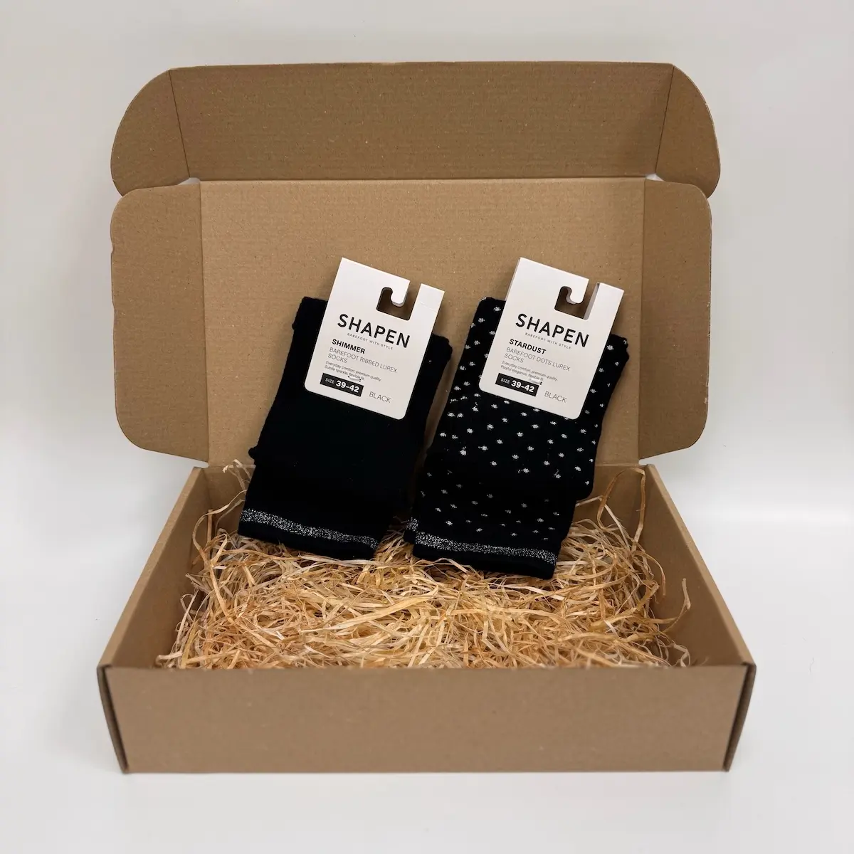 Darilni paket vsebuje 2 para Shapen nogavic (Shimmer in Stardust Black). V paket lahko dodate tudi  darilni bon v vrednosti 20€ ali par gel distančnikov.