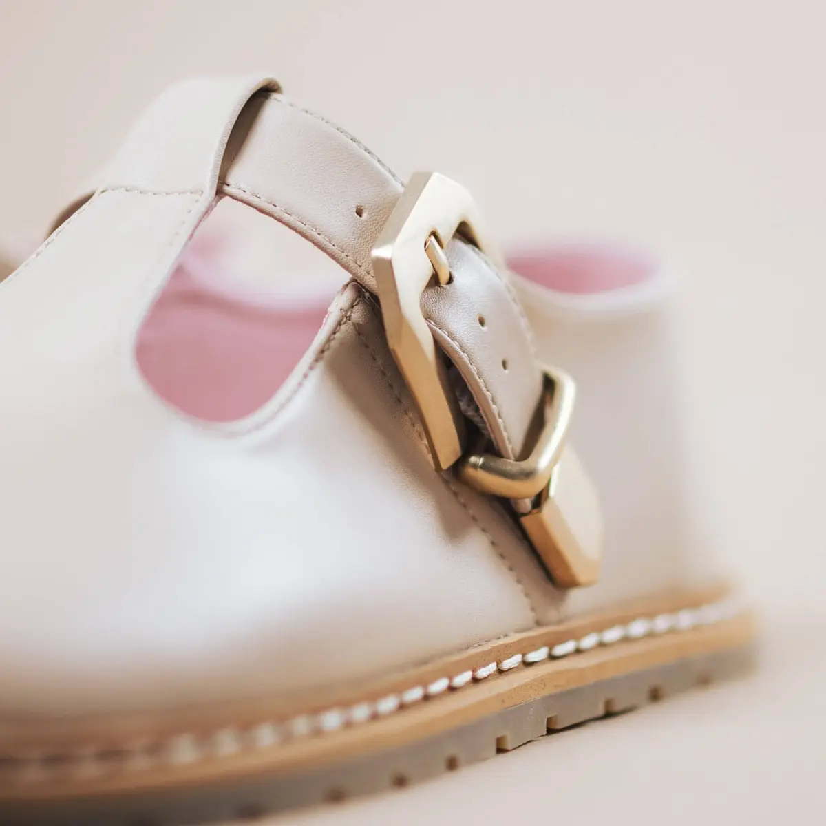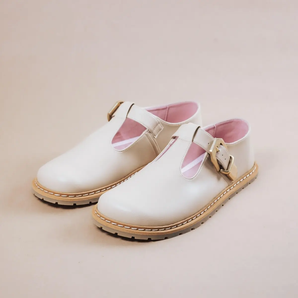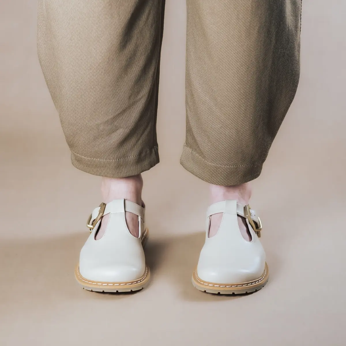 Bosonogi Mary Jane čevlji nežni krem barvi.