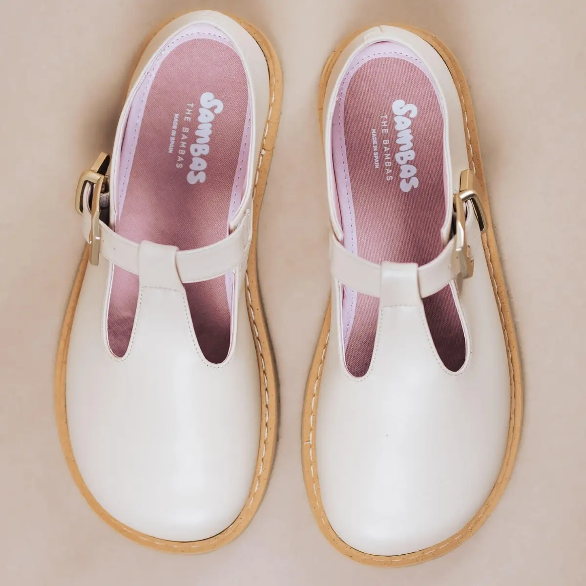 Elegantni bosonogi čevlji v stilu Mary Jane primerni za urbano okolje in vsakodnevne obveznosti. tanek in prožen podplat (5,5 mm) odstranljiv vložek (4 mm) čevlji se s paščkom na nartu prilagodijo stopalom različnih volumnov primerni za srednje do široka stopala izdelani v Španiji veganski Brezčasen Mary Jane model čevljev v krem barvi, ki se enostavno kombinira z različnimi stili. S svojo prefinjeno eleganco, ki spoštuje naravno anatomijo stopala so primerni za udobno gibanje skozi ves dan.V notranjosti je podloga iz organskega bombaža, ki je prijeten na koži in brez škodljivih kemikalij, zaradi česar se lahko nosijo tudi na boso nogo. Čevlji se zapenenjajo s kovinsko zaponko, ki omogoča prilagajanje in prileganje različnim volumnom stopal. Podplati so tanki in prožni ter narejeni iz naravne gume (5,5 mm; 3 mm osnove in 2,5 mm profila). Vložki (4 mm) so odstranljivi in izdelani iz kokosovih vlaken so naravno vpojni in termoregulacijski. Idealni so za prehod na bosonogo obutev, prilagajanje velikosti ali zagotavljanje dodatne zaščite in udobja. Ko vložek odstranite, stopalo počiva neposredno na enakem organskem materialu, kot je uporabljen za podlogo in notranji del čevlja. Sambas the Bambas izpolnjujejo vse lastnosti bosonoge obutve in popolnoma posnemajo bosonogo hojo. Omogočajo prosto, udobno in naravno gibanje stopal brez kakršnihkoli omejitev.