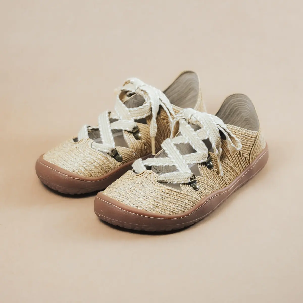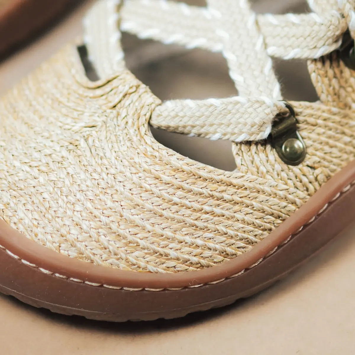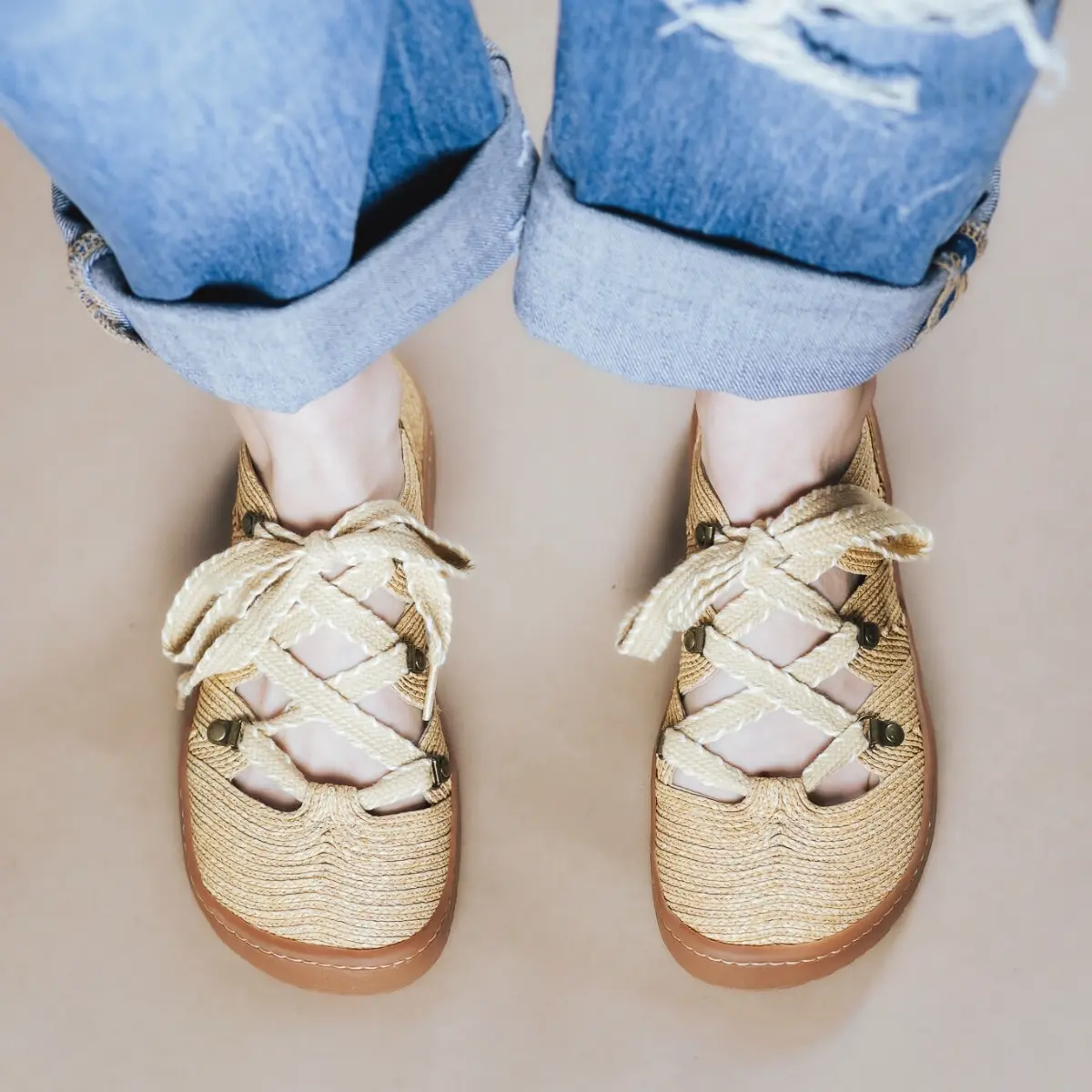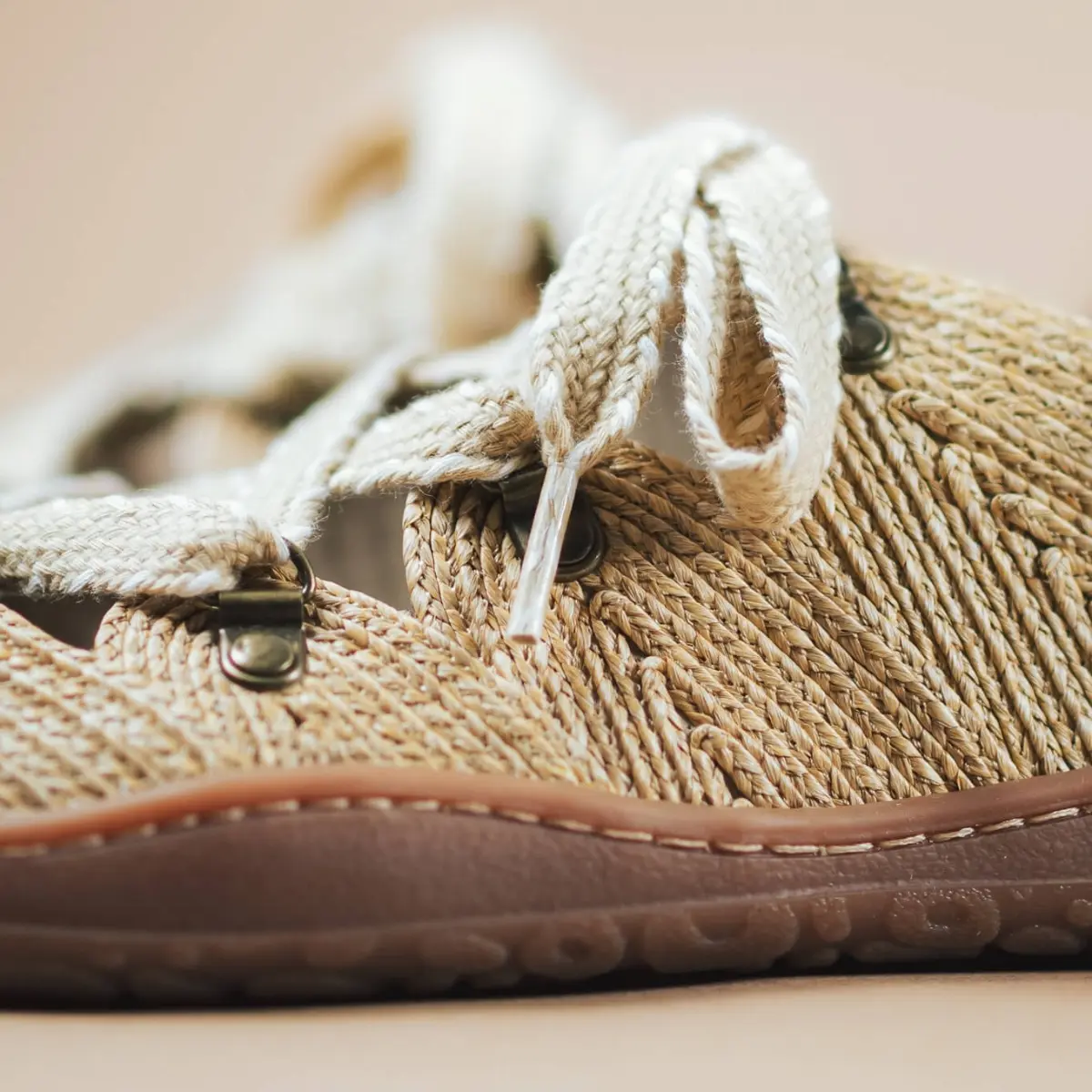Bosonogi poletni čevlji v naravnih tonih iz skrbno česane in ročno pletene jute.