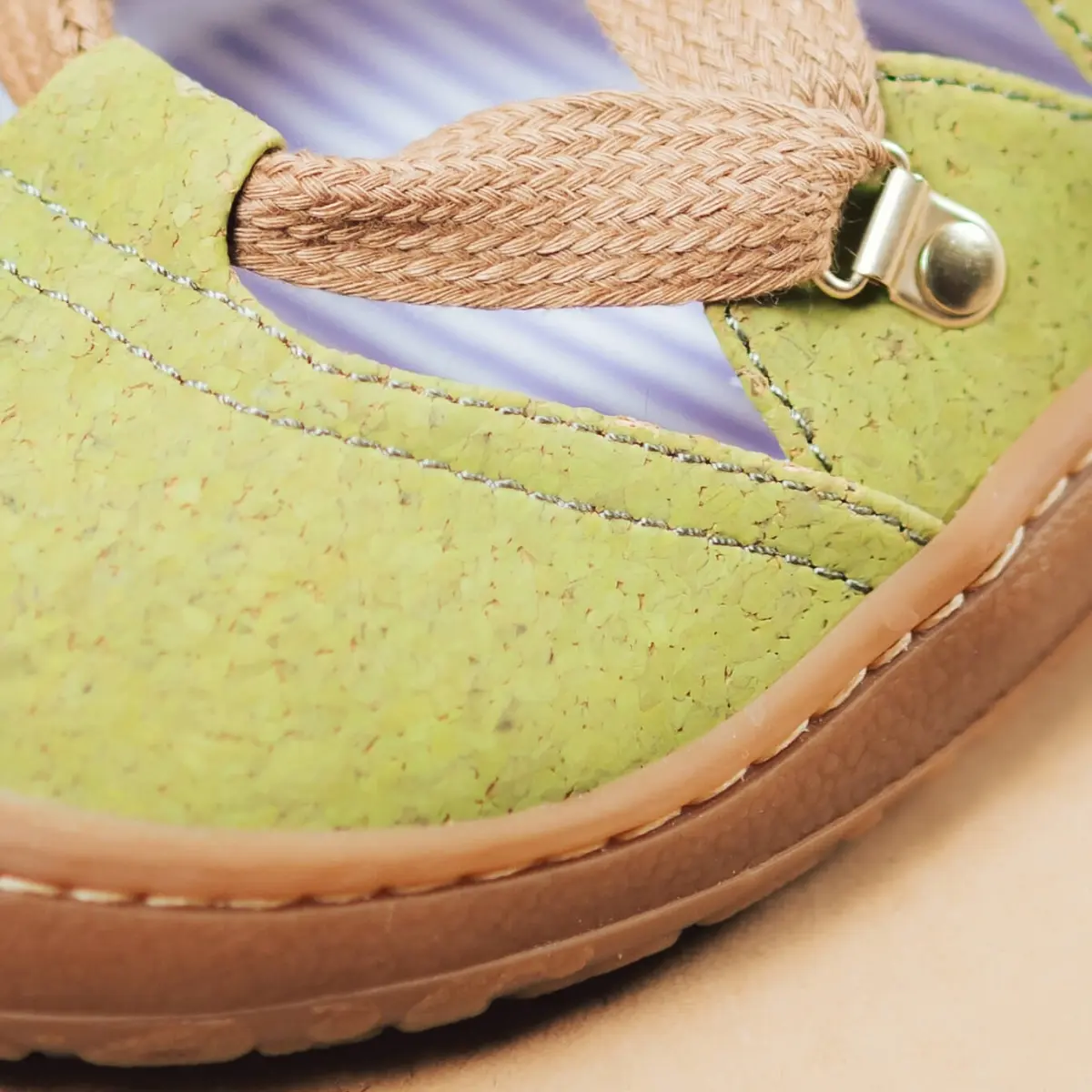 zunanji del: pluta podloga: organski bombaž podplat: rastlinska guma (TPR) vložek: kokosova vlakna + bombaž vezalke: bombaž Čevlji so ročno izdelani v Španiji iz lokalnih, veganskih in visokokakovostnih materialov.